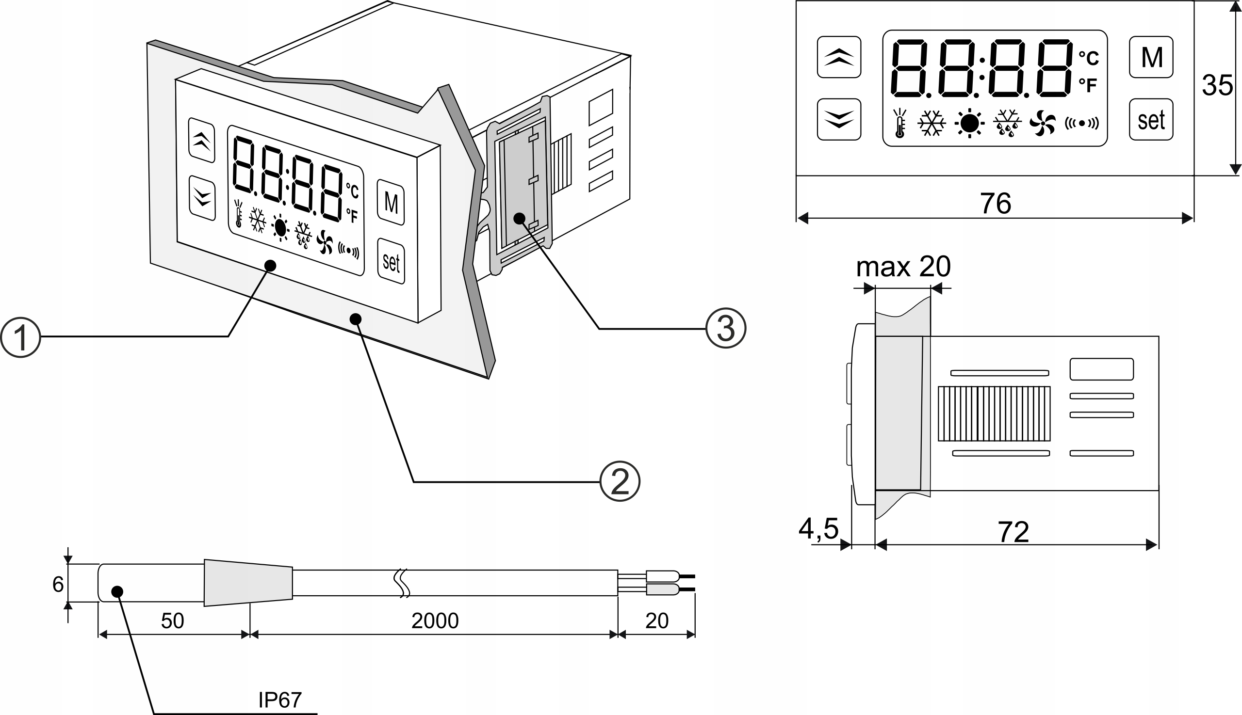 2/ Montaż w otworze o wymiarach 71 x 29 mm, maksymalna grubość ścianki tablicy 20mm