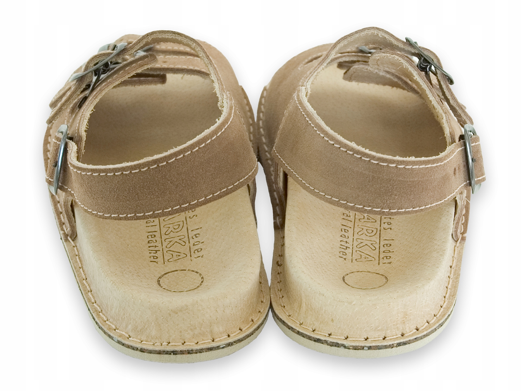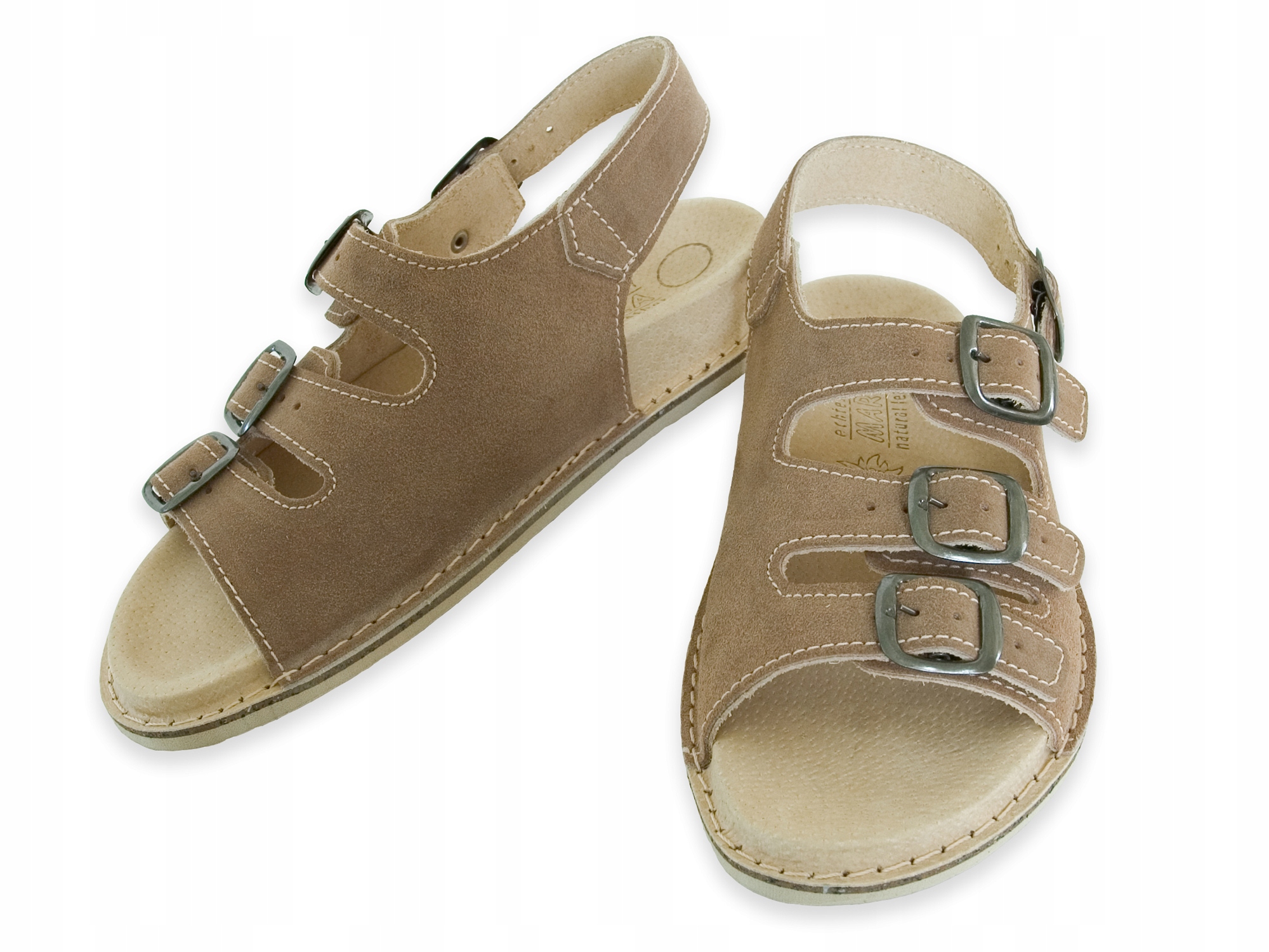 Sandały skórzane w całości wykonane są ze skór naturalnych (dwoina bydlęca). W krótkim czasie miękka ortopedyczna wkładka dopasowuje się do stopy zapewniając swobodę i komfort użytkowania. Sandały posiadają płynną regulacje wysokości podbicia (trzy paski + jeden na pięcie). Doskonale nadają się do długich pieszych wędrówek. Podeszwa wykonana jest z antypoślizgowego styrogumu. Dostępne w kolorze cappuccino i niebieskim. Obuwie objęte jest dwuletnią gwarancją producenta. Wyprodukowane w Polsce.
