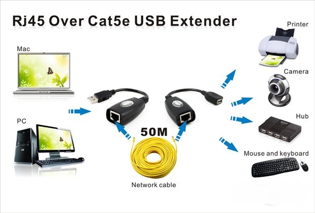 Przedłużacz USB umożliwia podłączanie urządzeń USB odległych nawet o 50 metrów za pośrednictwem kabla sieciowego typu skrętka (patch Cat5/5e/6), zakończonego standardowymi złączami RJ45.