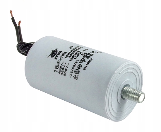 Kondensator rozruchowy do silników 16uF/450VAC +/-10% 40x70mm Temp. pracy -25C~+70C, sposób mocowania: śruba M8, przewód o średnicy 2,8mm