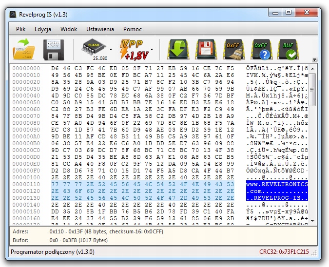- возможность изменения названия производителя, модели, номера серийного, пересчета контрольных сумм с помощью программного обеспечения REVELPROG-IS,