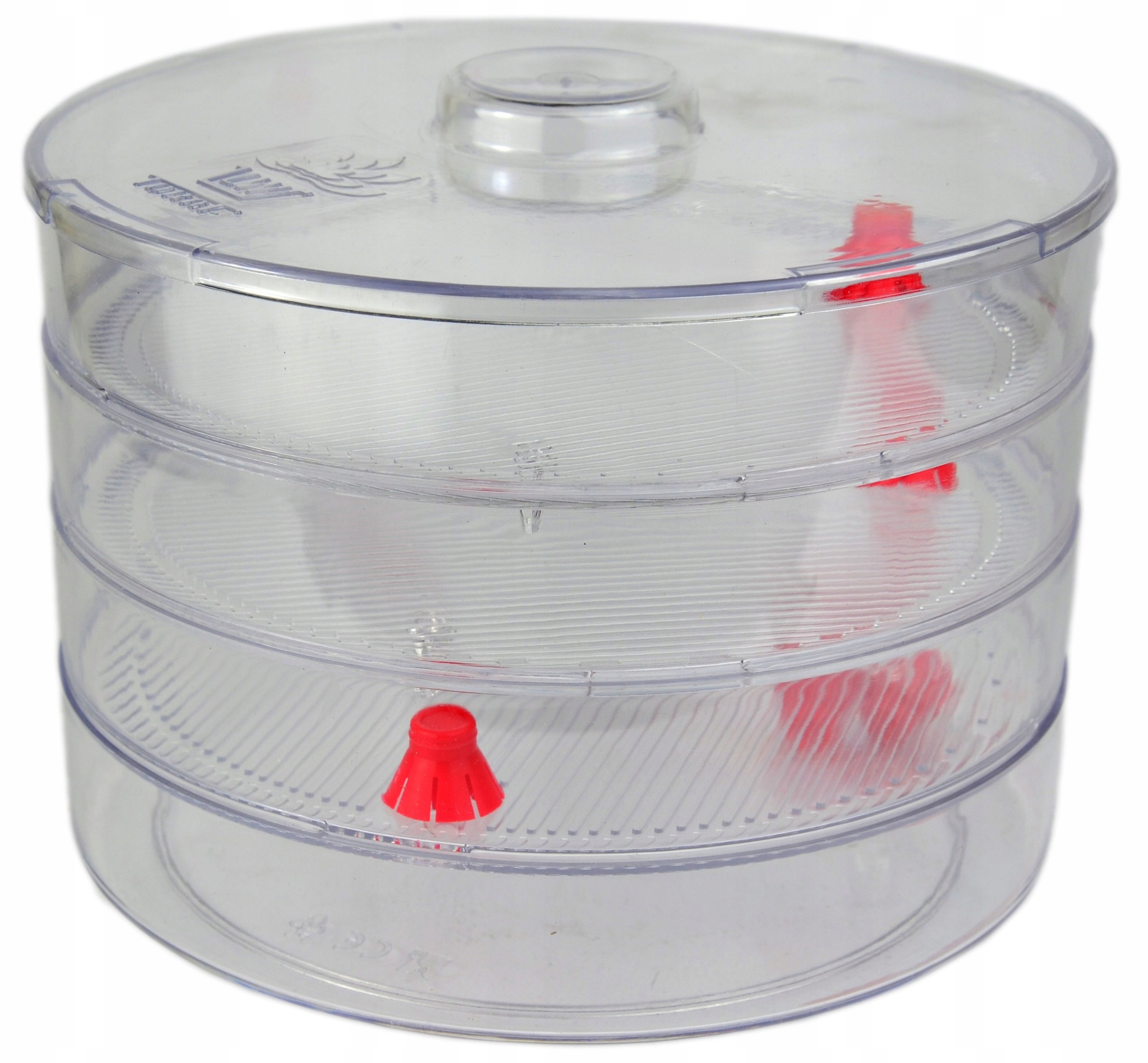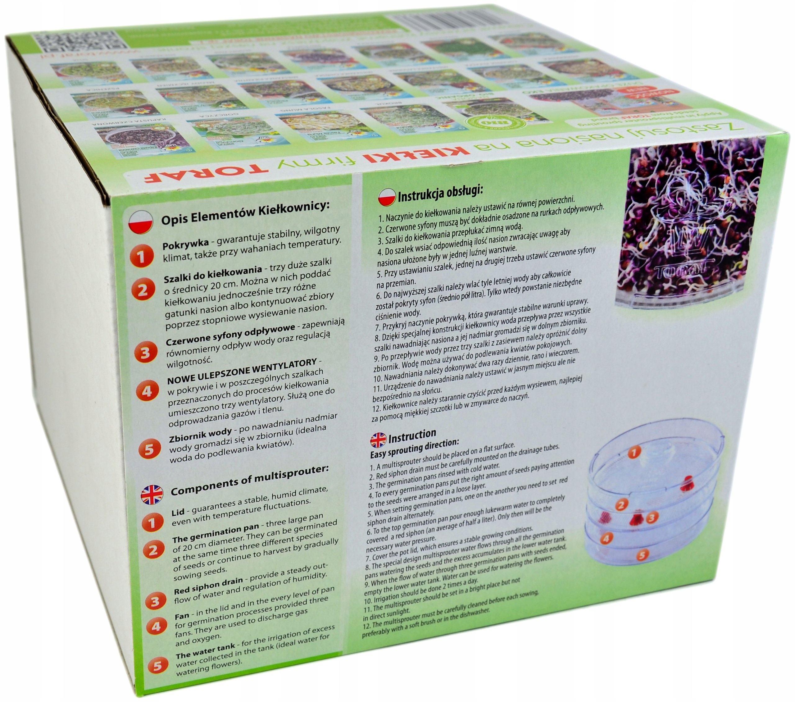 Kiełkownica składa się z 3 szalek do uprawy kiełków, pokrywki oraz zbiornika na wodę. Czerwone syfony odpływowe - zapewniają równomierny odpływ wody oraz regulacją wilgotność. W pokrywce i w poszczególnych szalkach przeznaczonych do procesów kiełkowania umieszczono trzy wentylatory, służą one do odprowadzania gazów i tlenu.