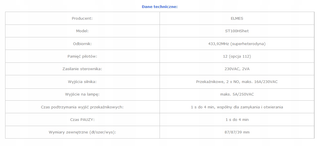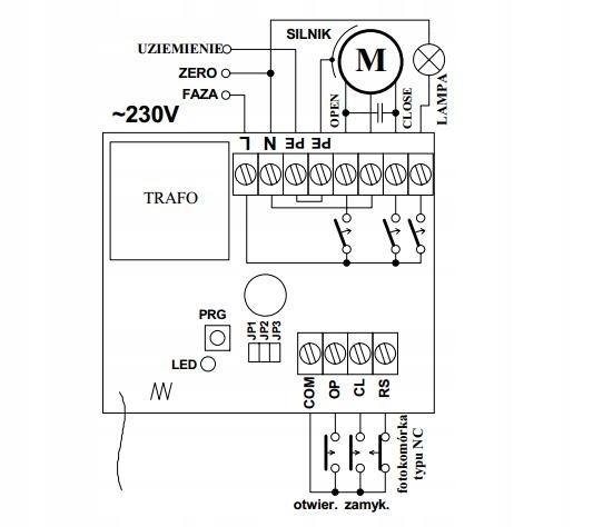 Sterownik przeznaczony jest do zdalnego sterowania urządzeniami, w których stosuje się bezkomutatorowy silnik prądu zmiennego. Sterownik ma zaciski do podłączenia sieci 230VAC, silnika 230VAC, lampy ostrzegawczej, wyłączników ściennych oraz sygnału z fotokomórki.