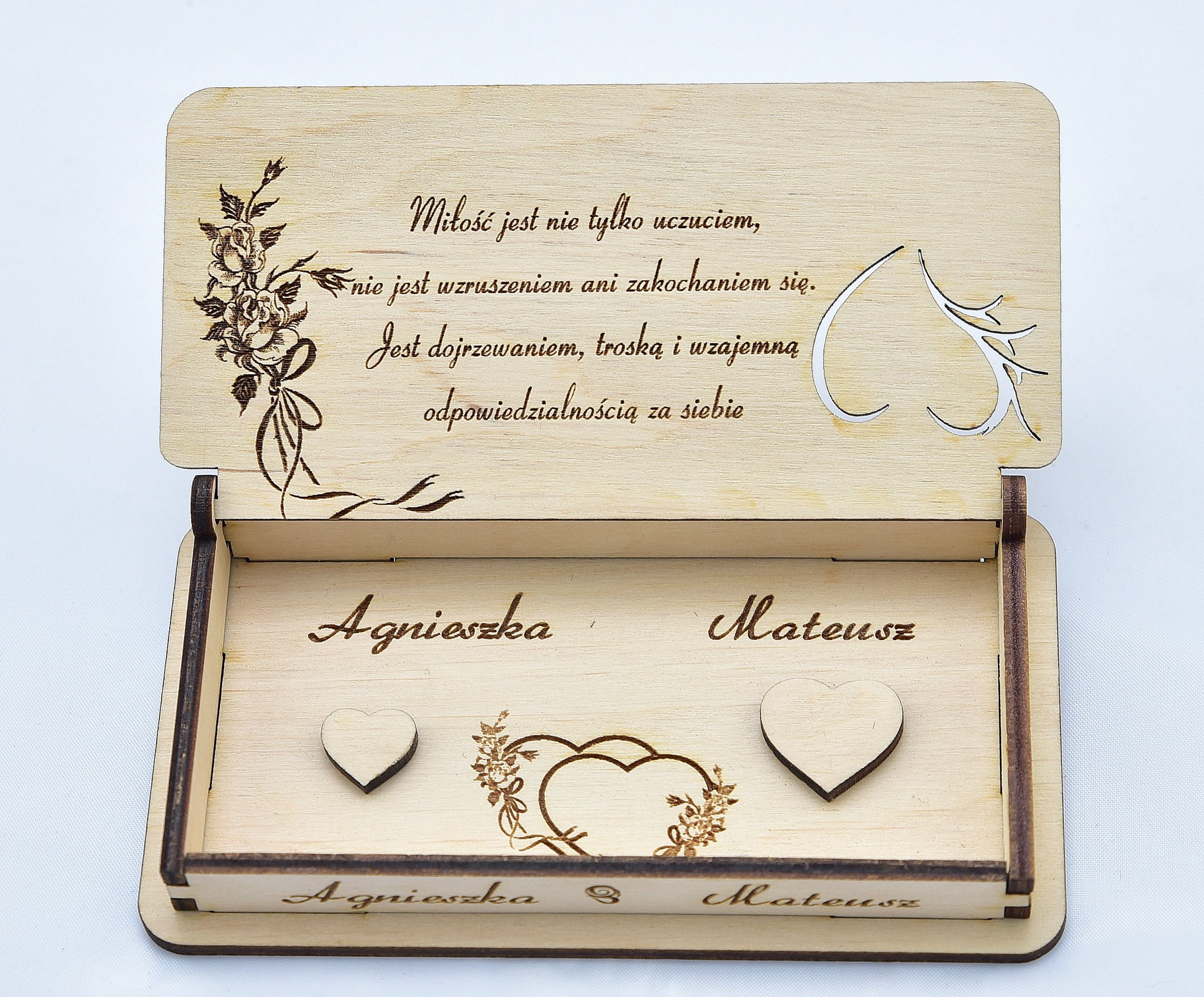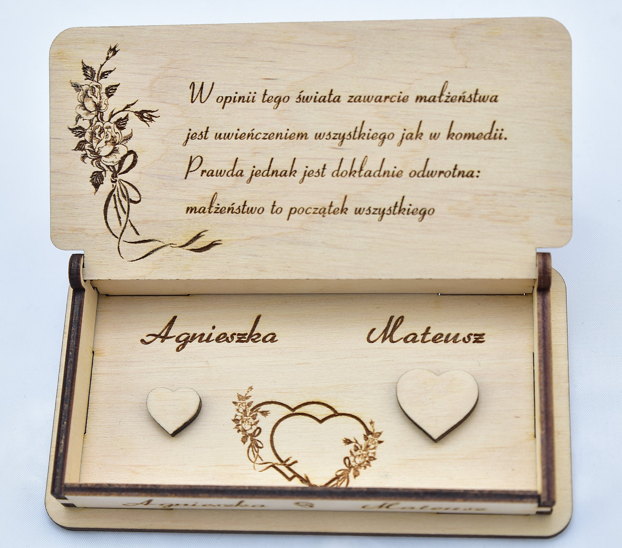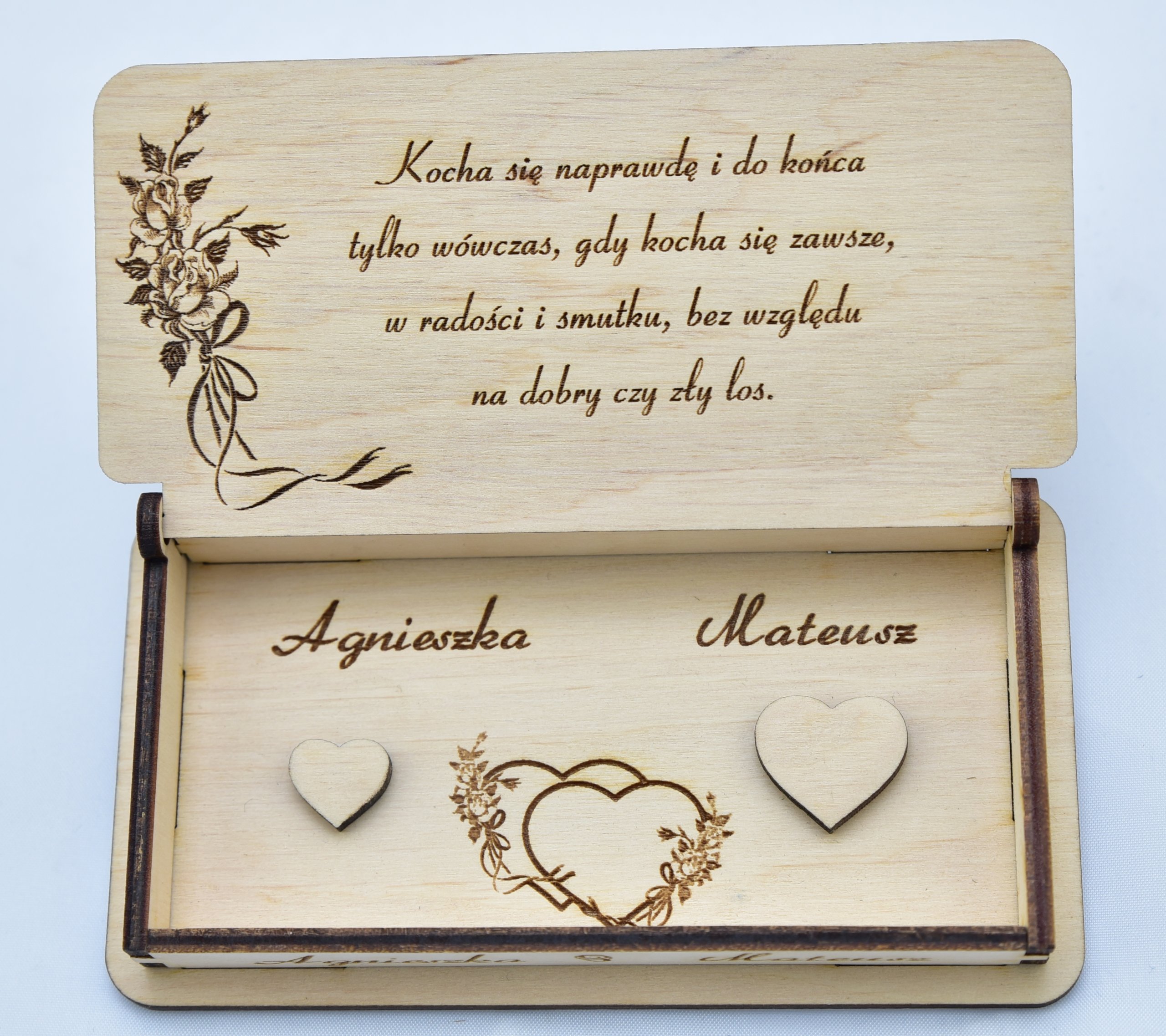 W przypadku zamówienia proszę podać numer graweru na zewnętrznej części pudełka i w środku oraz imiona i datę. Np. 3C Anna i Łukasz 28.12.2019