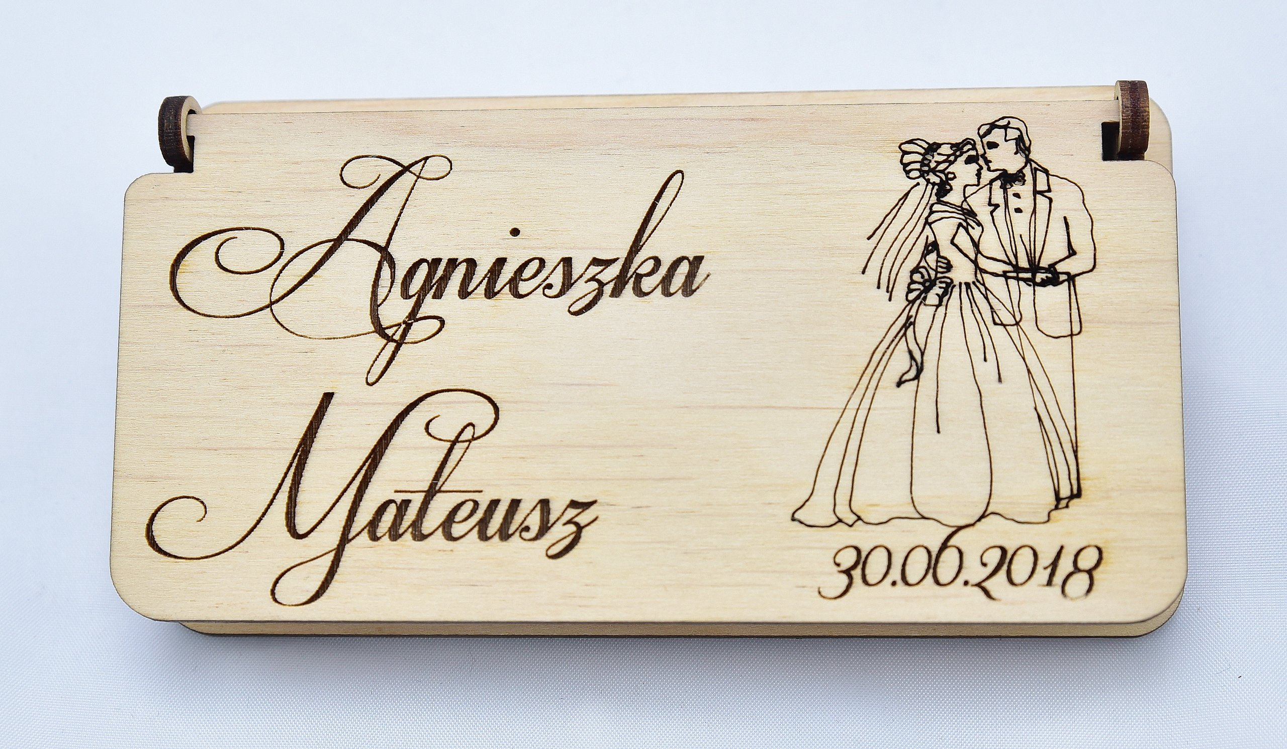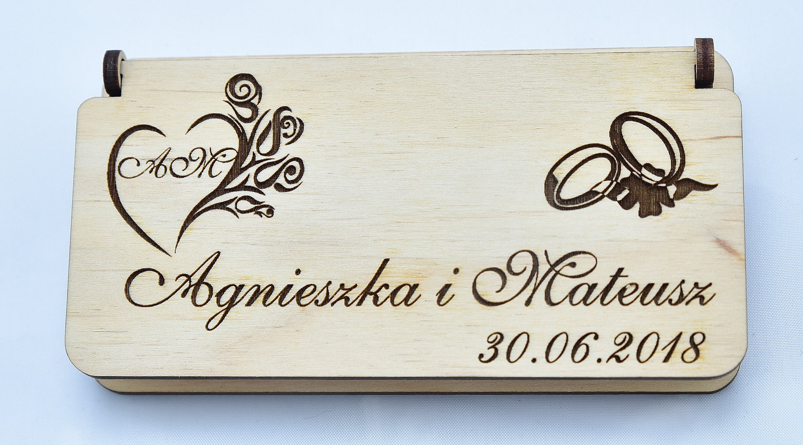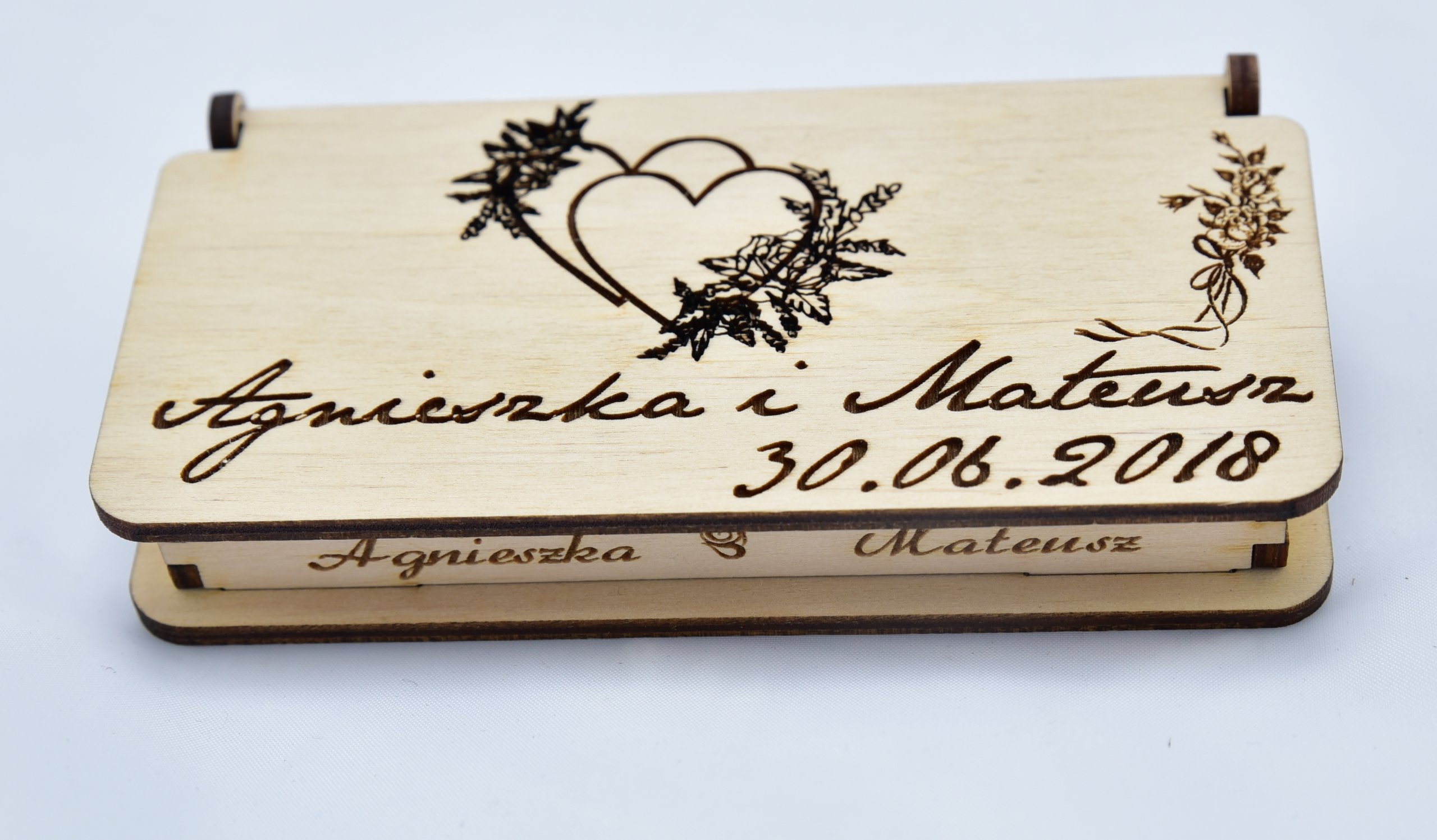 W przypadku zamówienia proszę podać numer graweru na zewnętrznej części pudełka i w środku oraz imiona i datę. Np. 3C Anna i Łukasz 28.12.2019
