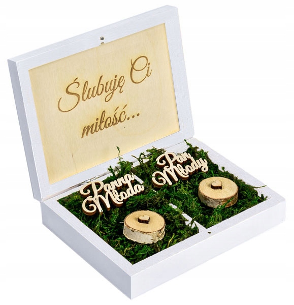 Napisy "Panna Młoda" i "Pan Młody" oraz serduszka domyślnie są w kolorze naturalnym ( nawet jeśli wybrano złoty kolor dekorów na pudełku). Na życzenie również mogą zostać pomalowane, prosimy w takim wypadku o dodatkową informację przy wysłaniu formularza. Nie ma możliwości zmiany koloru brzozowych krążków oraz tabliczki wewnątrz pudełka na obrączki.