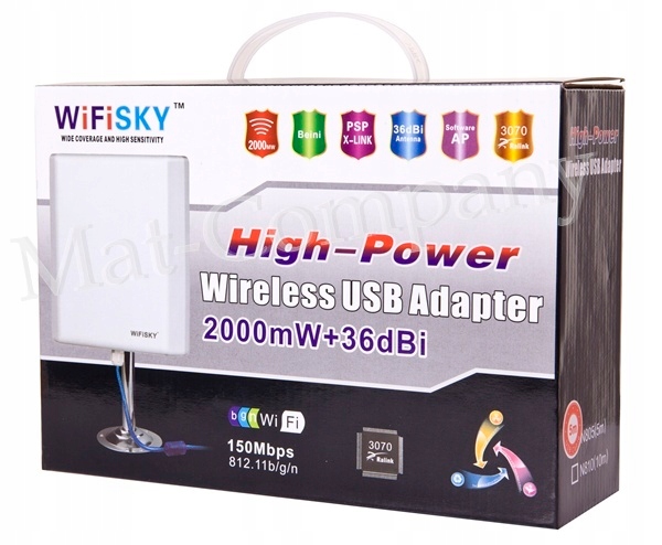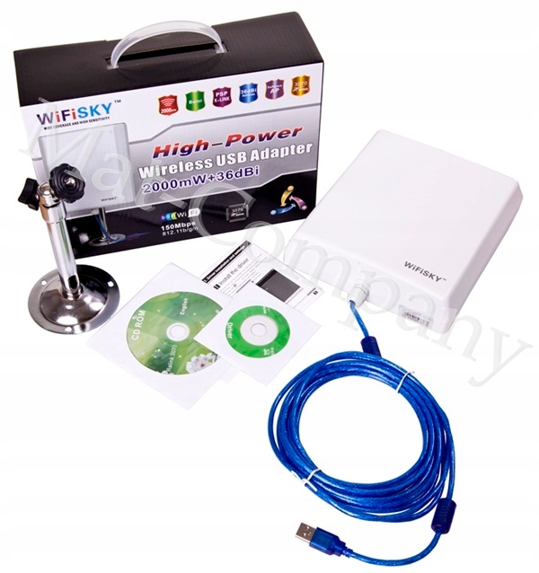 Oferowana antena oparta jest na nowy chipsecie Ralink RT3070 150Mbps - moc wyjściowa karty to 2000mW dzięki wbudowanej antenie WiFi SKY 36dBi pozwala na realizację nawet bardzo odległych połączeń.