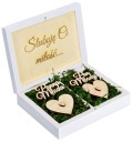 Napisy "Panna Młoda" i "Pan Młody" oraz serduszka domyślnie są w kolorze naturalnym ( nawet jeśli wybrano złoty kolor dekorów na pudełkach). Na życzenie również mogą zostać pomalowane na złoto, prosimy w takim wypadku o dodatkową informację przy wysłaniu formularza. Nie ma możliwości zmiany koloru brzozowych krążków oraz tabliczki wewnątrz pudełka na obrączki.