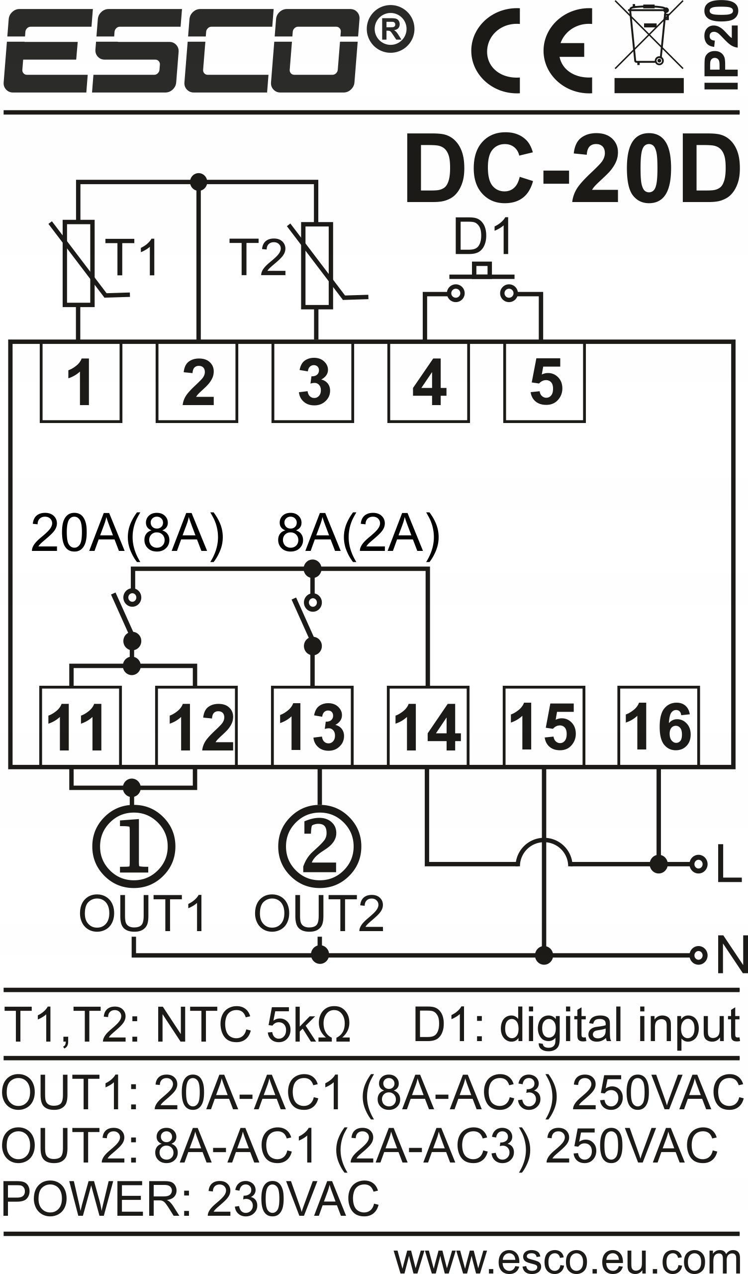 Regulator wyposażony jest w 2 Wyjścia przekaźnikowe dużej mocy 20A i 8A (maksymalne obciążenie rezystancyjne 4500W dla wyjścia 20A). Montaż w rozdzielni elektrycznej na szynę DIN TH-35.