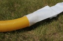 Для того, чтобы надеть рукав на трубу, конец трубы оборачиваем пленкой или накладываем полиэтиленовый пакет (оборачиваем шпагатом или резинкой для защита от скольжения фольги). Затем разворачиваем трубу и начинаем надевать рукав. Медленно натягиваем рукав и опускаем его дальше.