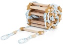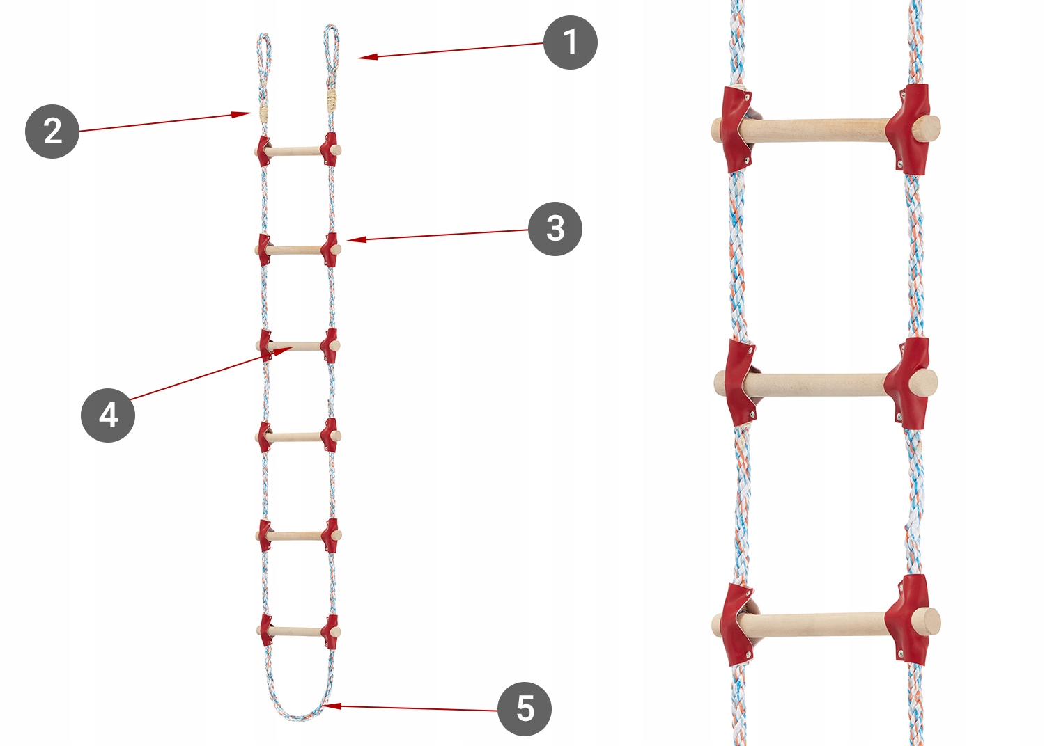 Głównym elementem nośnym naszych drabin sznurowych są 48 żyłowe liny polipropylenowe. Polipropylen to materiał należący do grupy tworzyw sztucznych o ciekawych właściwościach. Jest bardzo wytrzymały na rozerwania i przetarcia. Dzięki temu, że jest w 100% odporny na działanie warunków atmosferycznych - jest niezwykle trwały i zachowuje przez lata swoje właściwości. Nasza drabina sznurowa posiada specjalną konstrukcję. Celowo zastosowaliśmy plecioną linę o średnicy 23mm, składającą się z 4 niezależnych mniejszych lin, z których każda posiada 12 żył. Taka konstrukcja lin zapewnia wyjątkowe bezpieczeństwo, trwałość, odporność na zrywanie oraz odpowiednią elastyczność. Dzięki zastosowaniu konstrukcji splotu - linę trudniej jest przeciąć lub uszkodzić (podobne rozwiązanie jak stosowane przy produkcji lin stalowych o największych parametrach wytrzymałościowych).