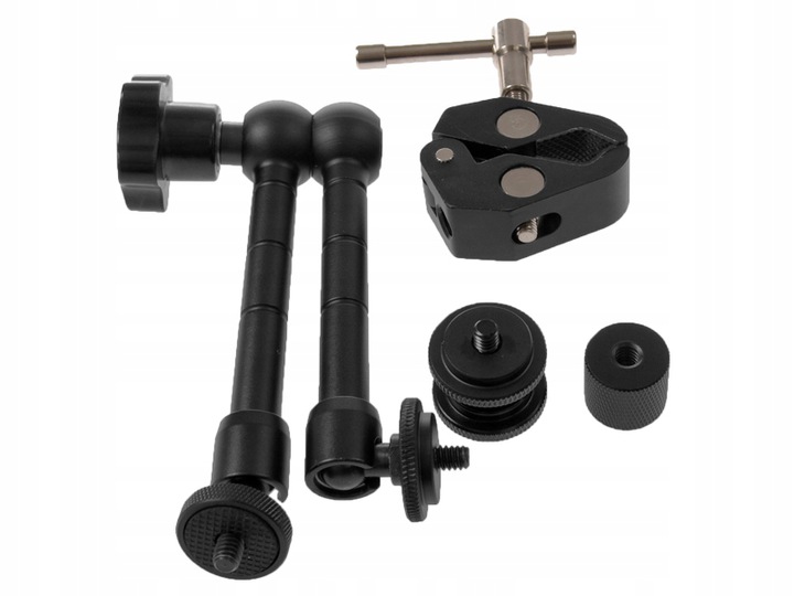 Uniwersalne ramię przegubowe 29 cm umożliwia podpięcie różnego rodzaju akcesoriów foto/wideo - lamp, mikrofonów, monitorów itp. - do aparatu, riga czy wrotki kamerowej, a dzięki dołączanemu uchwytowi crab clamp rurki lub poprzeczki nie przekraczające średnicę 5 cm.