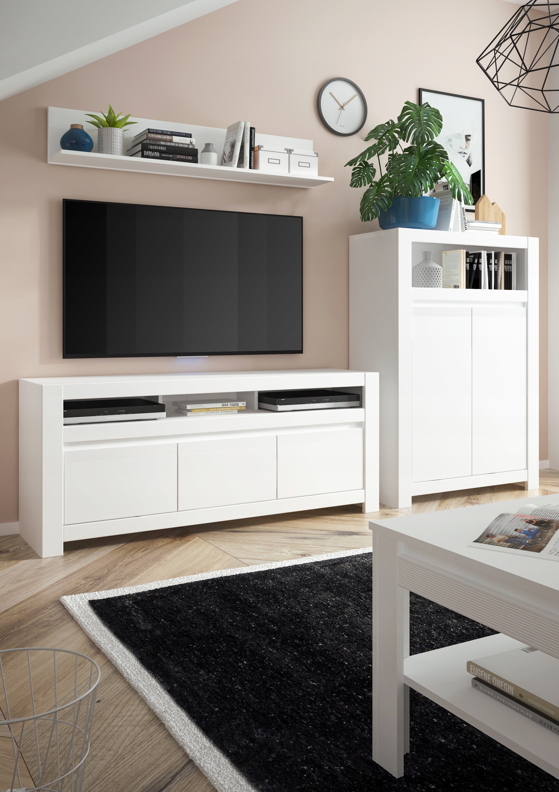 Коллекция Novi - это простая, элегантная форма, которая наверняка сохранится испытания меняющихся тенденций. Гладкая поверхность белых фронтов была разбита рифлеными молдинги одного цвета, создавая при этом отличительную черту всей коллекции. Традиционные ручки были заменены удобной безрычажной системой. Полностью выдвижные ящики, направляющие синхронные в столе и высококачественные матовые фасады МДФ сохранят порядок и порядок. Универсальность объемов позволяет обустройство гостиной, столовой и молодежной комнаты.