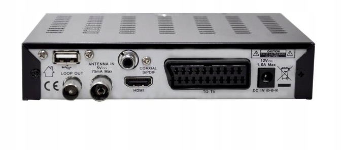 Połączenia: 1 x HDMI (z HDCP), 1 x cyfrowy audio COAXIAL S / PDIF (elektryczny), 1 x USB 2.0 (maks. 500 mA), zasilanie 12 V DC (100-240 V / 50 Hz), 1 x TV SCART, IEC Socket OUT (praca przelotowa), gniazdo IEC IN (5 V / 75 mA)