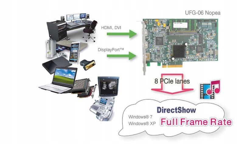 The practically limitless speed of UFG-06 Nopea capture board enables your full creativity with video and audio design. You can now concentrate on your main task – there are no захват bottlenecks effecting your work. With full compatibility to any HDMI 1.4 and DisplayPort™ source up это 1080p60 or 1920x1200p60, video and audio contents will be captured frame by frame with the original speed. The high native capture rate means that your материал, will be transferred to the PC without any dropped frames or compression. Both of these advantages ensure that captured stream is as close to the original as possible. Any dropped frames will make the streamed video unnecessarily fuzzy and compromise your high quality материал. With full DirectShow support UFG-06 Nopea can be used with any compatible Windows 7, Vista or XP streaming application. All powerful features of the board are readily available.