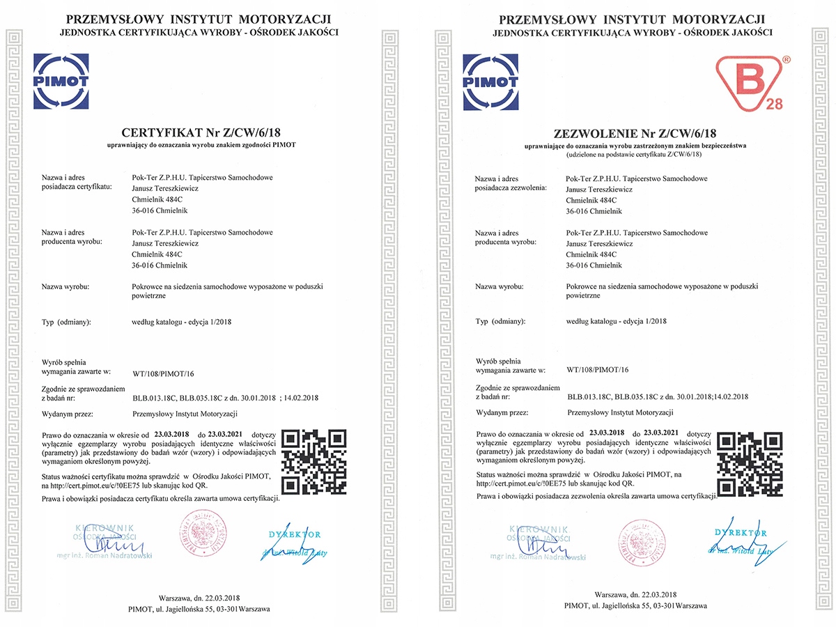 W miejscu bocznych poduszek powietrznych zastosowaliśmy specjalny niewidoczny szew, dzięki któremu pokrowiec w przypadku konieczności uruchomienia poduszek nie opóźni ich reakcji. Potwierdza to certyfikat bezpieczeństwa B28 wydawany przez PIMOT.