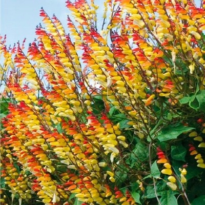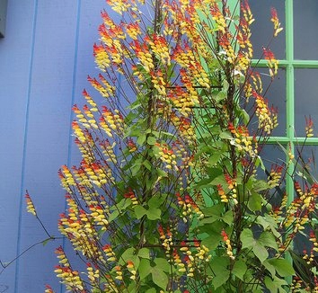 Однолетнее вьющееся растение высотой до 5 м с многочисленными, сначала красными, потом красными желто-белые цветки собраны в величественные правильные соцветия.