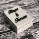 Pudełko drewniane na obrączki Silver malowane w kolorze srebrnym z poduszeczkami pikowanymi wraz z personalizacja z czarnego hdf, a całość urozmaica cytat grawerowany na lustrzanej srebrnej plexi.