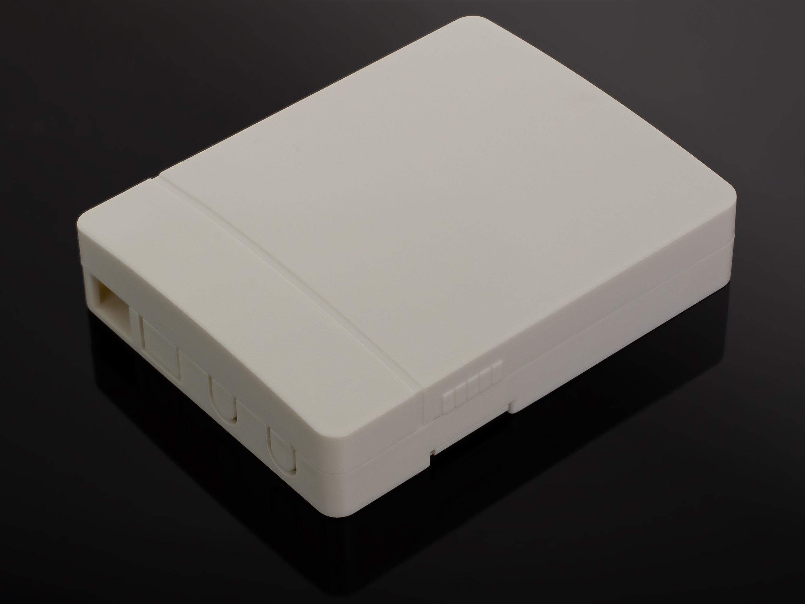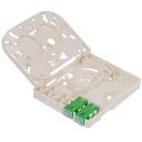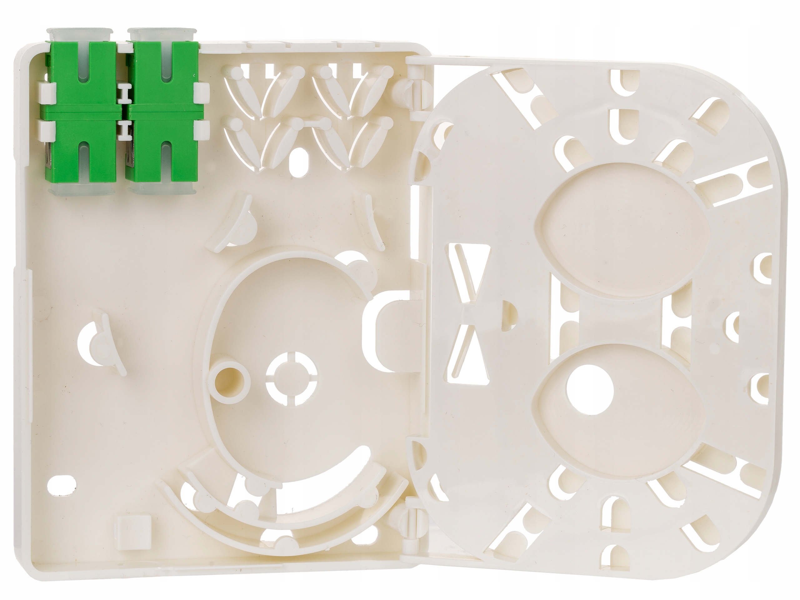 Gniazdo abonenckie światłowodowe FTTH do montażu naściennego, z miejscem na adaptery SC/LC (brak w zestawie, max pojemność opisana poniżej) oraz z tacką spawu na zawiasach. Przeznaczone do zakończenia linii światłowodowej w lokalu abonenta.