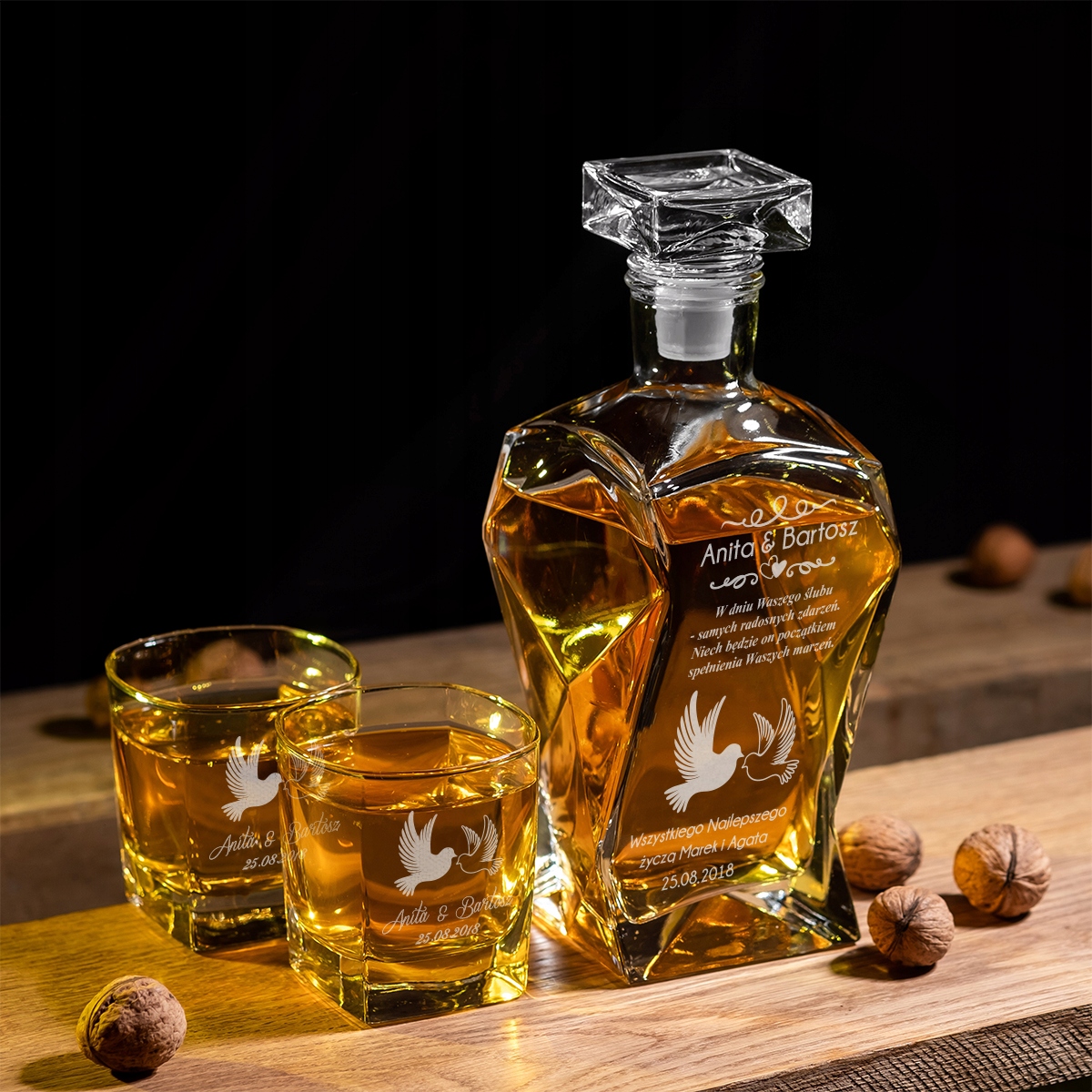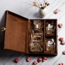 Karafka wykonana jest ze szkła, posiada szklane zamknięcie z uszczelnieniem z tworzywa, co zabezpiecza trunek podczas jego przechowywania. Drewniana skrzynka w dwóch kolorach do wyboru posiada eleganckie metalowe zamknięcie oraz wypełnienie z wiórków papierowych. Szklanki do whisky wykonane są z najwyższej jakości szkła. Produkty te cechuje niebywała elegancja i subtelność kształtów.