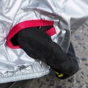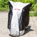 Pokrowiec wykończono elastycznym ściągaczem, dzięki czemu jego dolna część ściślej układa się wokół jednośladu, utrudniając przedostawanie się do wewnątrz kurzu, brudu czy wody. W połączeniu z mocnym, solidnie przyszytym paskiem spinającym oraz uwzględniającym kształt motocykla krojem zapewnia to dobre ułożenie pokrowca, przy zmniejszonym jednocześnie ryzyku zsunięcia się czy zerwania go przez wiatr.