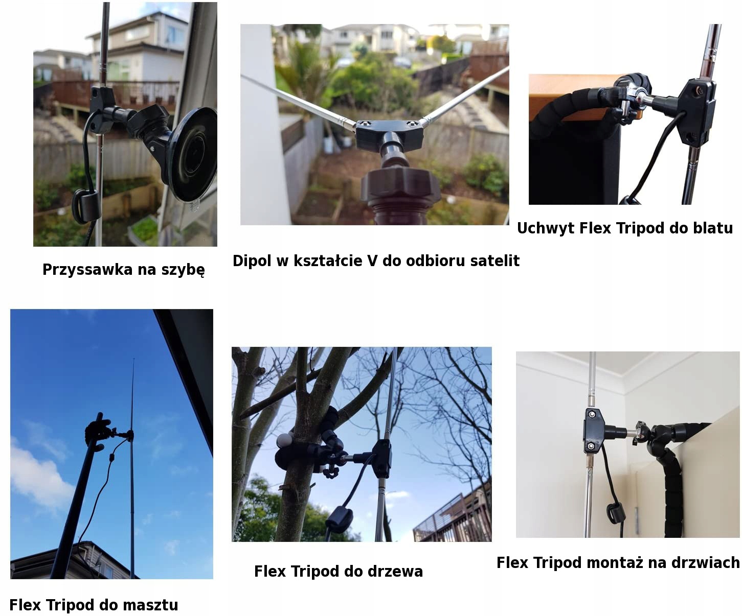 В комплект входят также крепления Flex Tripod, присоска для стекла и проводка 3M RG-174. Пример монтажа в галерея предметов.