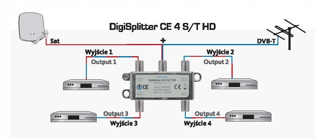 Rozgałęźnik DigiSplitter CE 4 S/T HD umożliwa rozdzielenie sygnału z anteny satelitarnej, naziemnej na 4 odbiorniki. Odbiór sygnału satelitarnego po rozgałęzieniu bedzie zależny, wyjątek stanowią programy o tej samej polaryzacji. Rozdzielenie sygnału telewizji naziemnej oraz kablowej jest całkowicie niezależne.