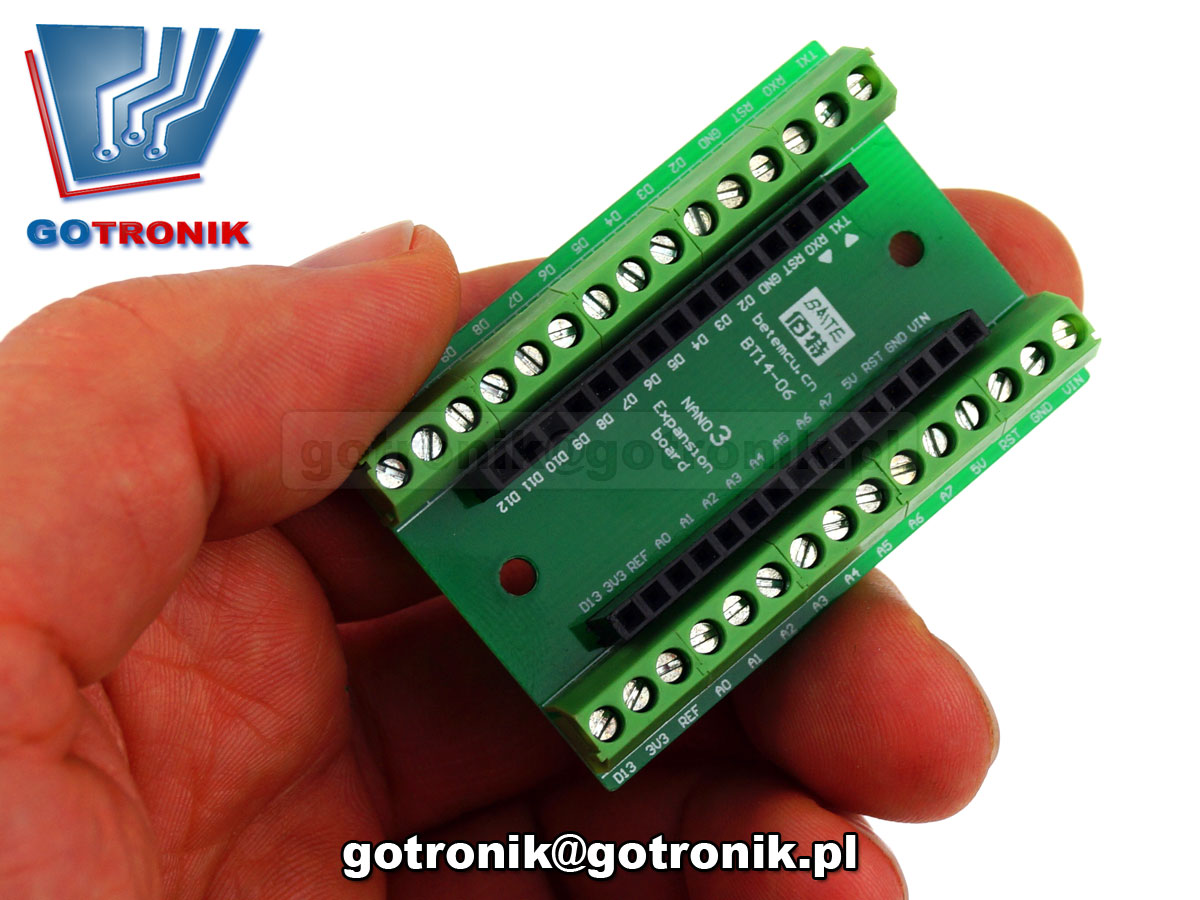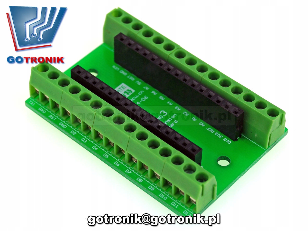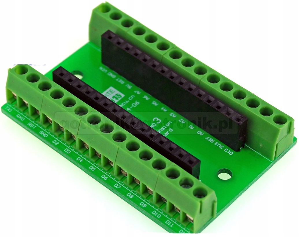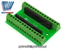 Adapter terminal block dla platformy mikroprocesorowej Arduino Nano 3.0. Umożliwia łatwe wyprowadzenie lub doprowadzenie sygnałów do Adruino przy pomocy przewodów lub kabli. Adapter wyposażony w złącza śrubowe do przykręcenia przewodów typu Terminal Block (Adruino expansion board)