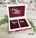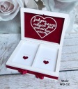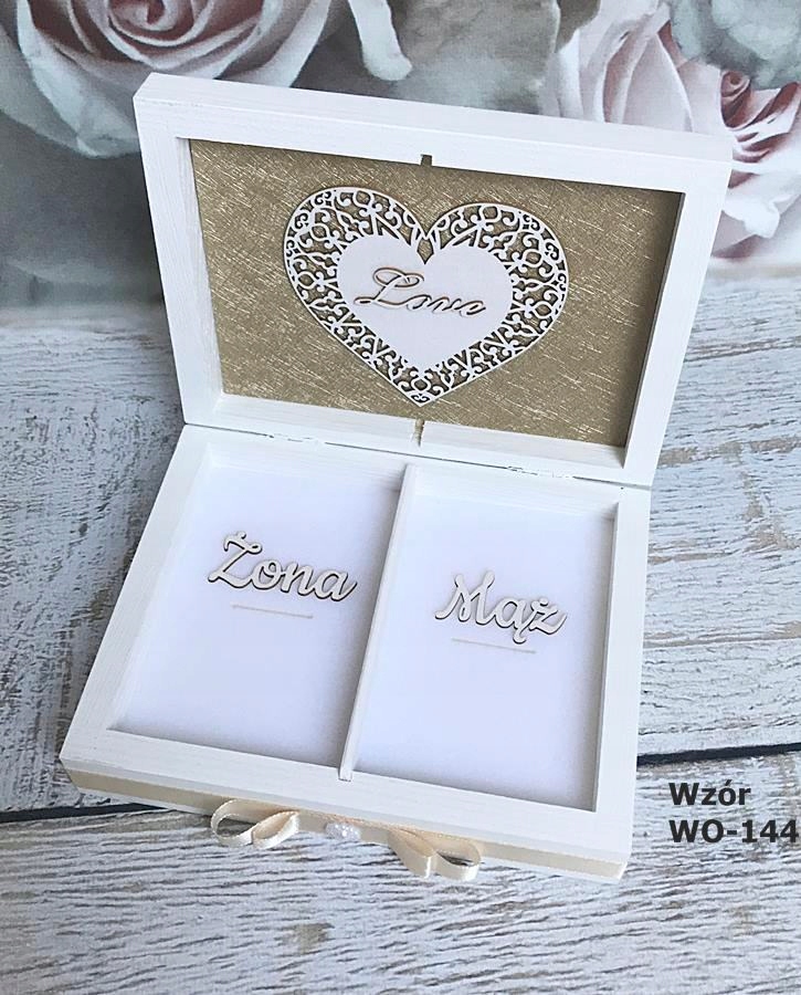 Na zewnątrz pudełka naklejony przestrzenny dekor gołąbki lub serca ( dekor lakierowany w kolorze złotym lub srebrnym) w zależności od wybranego modelu