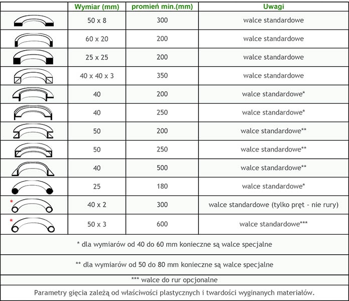 Размеры и характеристики изгиба для различных профилей приведены в таблице в далее в описании.
