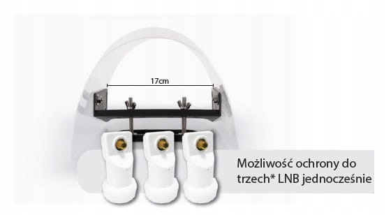 Osłona z tej oferty posiada większy rozmiar niż produkty konkurencji, dzięki czemu można ją montować na antenach o szerokich wysięgnikach i w zastosowaniu z kilkoma konwerterami oraz konwerterami typu monoblock.