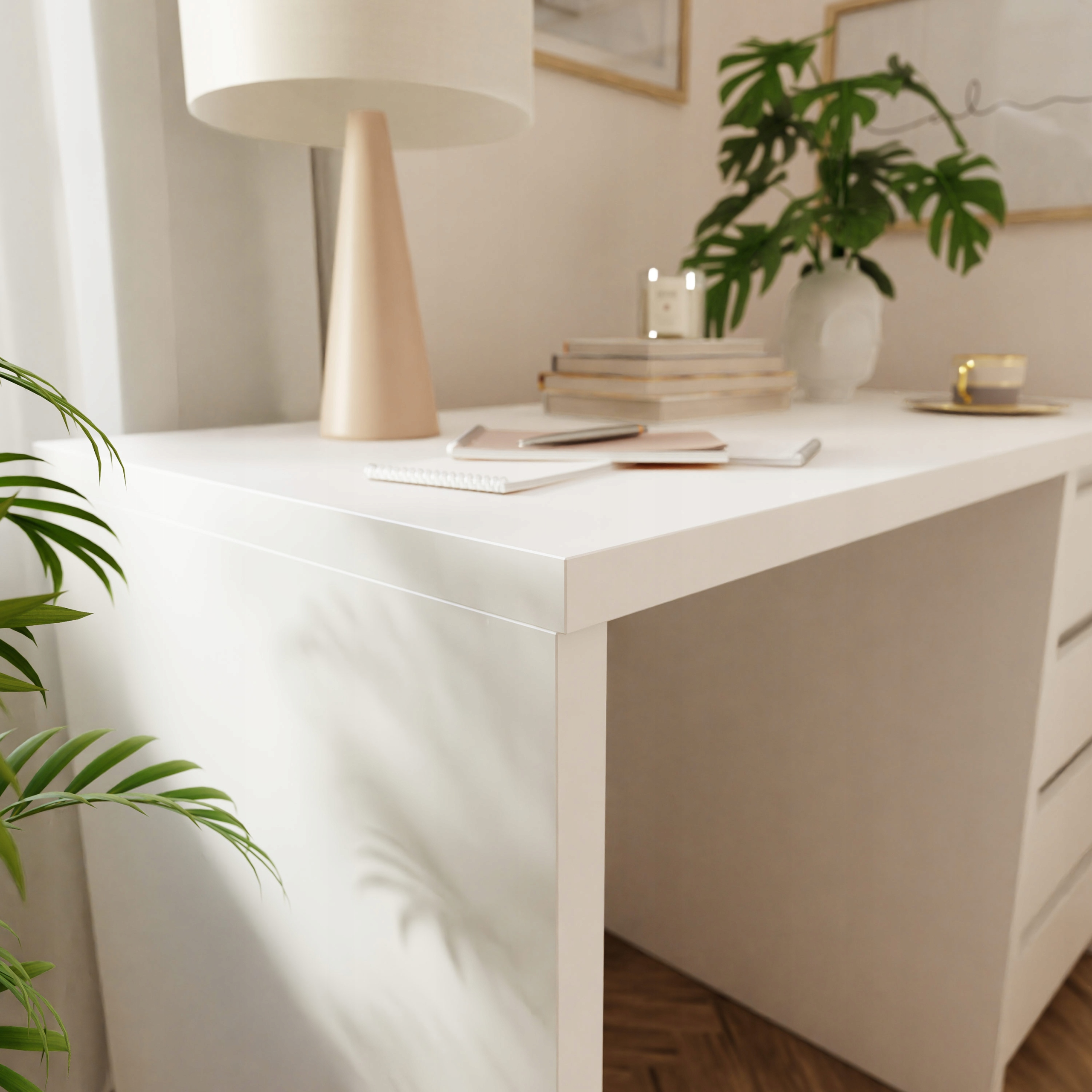 Minimalistyczna forma o wyrazistym prostym kształcie sprawia, że mebel ten doskonale odnajdzie się w każdym pomieszczeniu, subtelnie wtapiając się w jego aranżację. Biurko jest wyposażone w cztery pojemne szuflady, w których z łatwością pomieścisz wszelkie niezbędne dokumenty i przybory biurowe. Konstrukcja została wykonana z wytrzymałej płyty laminowanej o grubości 28 mm wzmocnionej obrzeżem ABS - dzięki takiemu rozwiązaniu całość jest bardziej odporna na uszkodzenia.