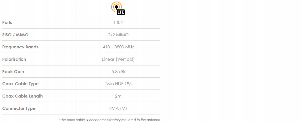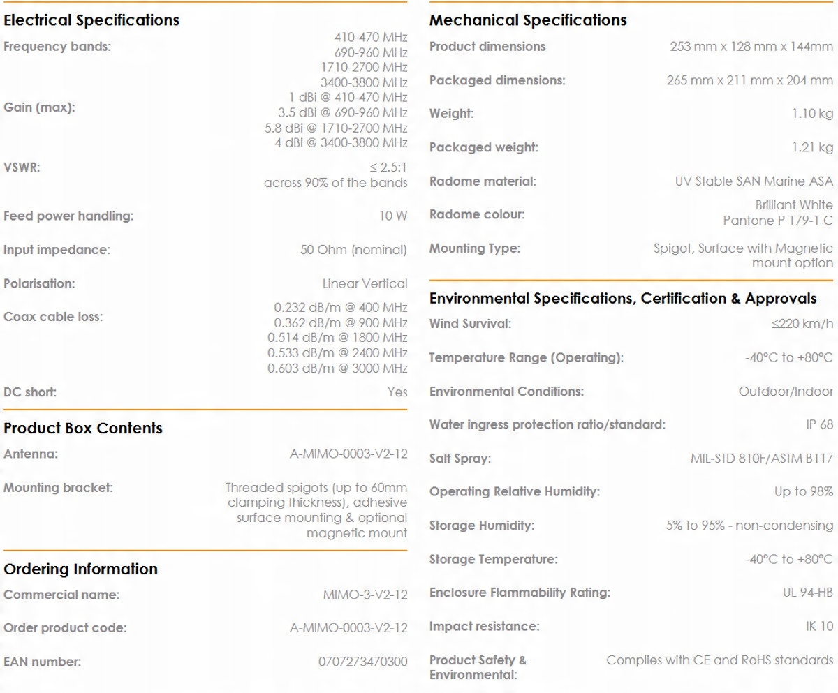 Высокопроизводительная wieloczęstotliwościowa антенна MIMO-3-12 2 в 1 в одном корпусе. Dwukomórkowe антенны MIMO (для 2G / 3G / 4G), включают в себя современные полосы от 690 Мгц до 2700 Мгц, а также новые появляющиеся спектра LTE и 5G для полос CBRS 450 Мгц и 3,5 Ггц, который становится популярным среди различных международных операторов мобильной связи для LTE. Ultraszerokopasmowa производительность антенны позволяет использовать ее на разных операторов и разные технологии, и готова на будущие мобильные технологии в 3,8 Ггц для приложений 5G. Антенна превышает эффективность большинства конкурентов благодаря заботе о проект этой высокопроизводительной антенны. Закономерности излучения всех элементы излучающими обеспечивают идеальный баланс между wielokierunkowością, разнообразием закономерности и хорошими способностями излучения на нужной высоте. Это очень важный критерий для транспортного рынка и морской. для которого антенна была специально разработана. Главная области применения транспортные средства, коммерческие / промышленные, морские, M2M и другие системы, использующие IoT широкий спектр технологий, радио, сохраняя при этом будущее в широком диапазоне частоты.