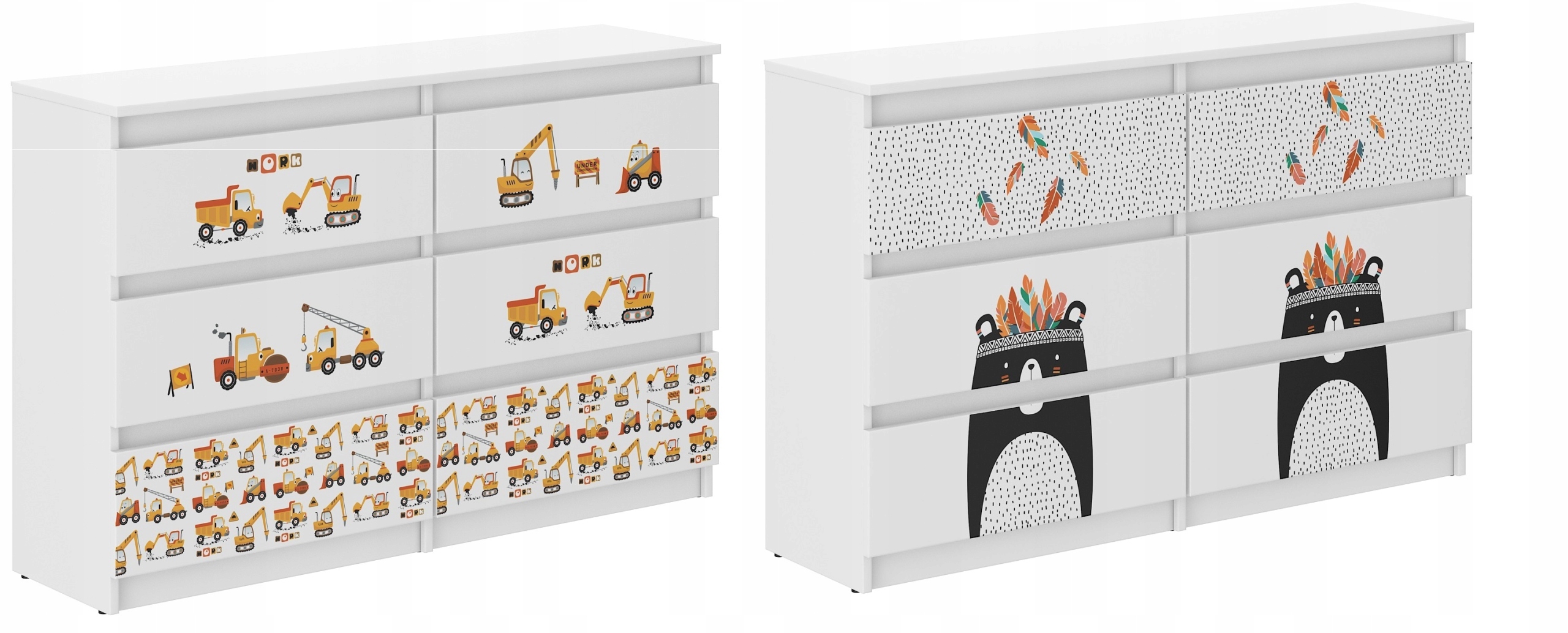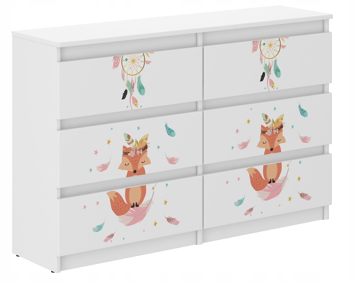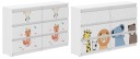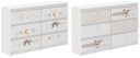Nowoczesna komoda R-120 to praktyczny i funkcjonalny mebel, który znajdzie swoje zastosowanie w każdym pokoju dziecięcym. Ergonomiczne wymiary zapewniają swobodne umeblowanie pomieszczenia. Komoda wykonany jest z płyty wiórowej kolor biały, wykończony okleiną. Składa się ona z szejściu szuflad, zamocowanych na prowadnicach, które zostały wyposażone w ograniczniki aby zapobiec całkowitemu wysunięciu. Drzwi komody posiadają kolorowy nadruk, który ma ładne żywe kolory i jest zabezpieczony specjalnym laminatem aby nie uległ wyblaknięciu lub ścieraniu. Można bez obaw myć go ściereczką i płynem.