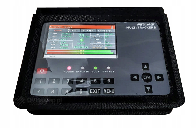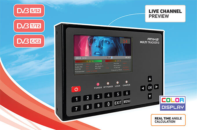 Multitracker uznanej firmy Amiko to zaawansowany miernik satelitarny do mierzenia i analizowania sygnałów telewizyjnych: satelitarnego, naziemnego i kablowego (DVB-T/T2, DVB-S/S2, DVB-C/C2). Wielofunkcyjność Multitrackera 3 pozwola m.in. na pomiar mocy, sprawdzenie jakości sygnału w każdym punkcie instalacji antenowej oraz na precyzyjne ustawienie anteny. Urządzenie zostało wyposażone w kolorowy wyświetlacz AMOLED o przekątnej 5'', który umożliwia podgląd poszczególnych stacji i prezentację aktualnych parametrów sygnału.