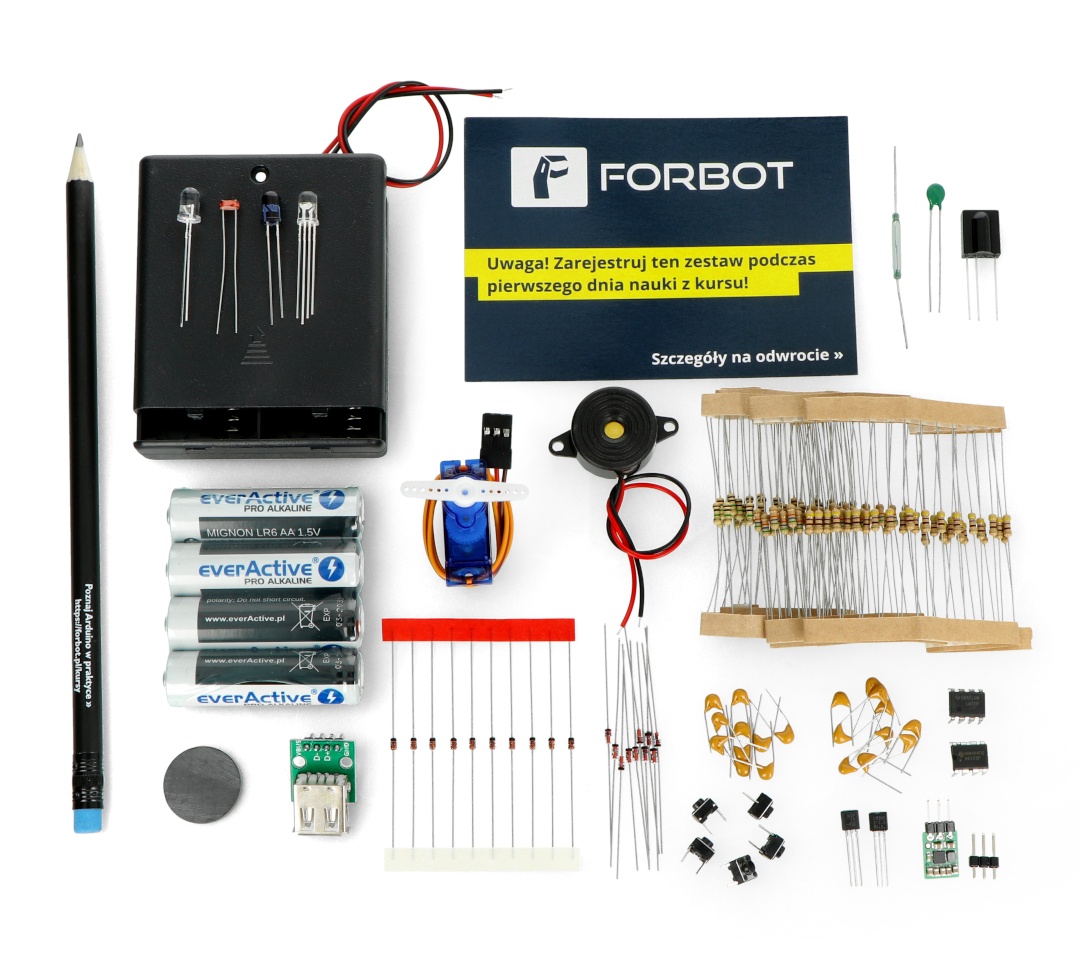 Kontynuacja popularnego kursu Podstawy Elektroniki. Zestaw zawiera elementy elektronicznie niezbędne do realizacji zadań opisanych w serwisie Forbot.pl. W komplecie znajdują się m.in. nadajnik i odbiornik podczerwieni, komparator, diody Zenera, micro serwo oraz baterie AA wraz z pojemnikiem. Całość dostarczana jest w poręcznym pudełku.