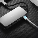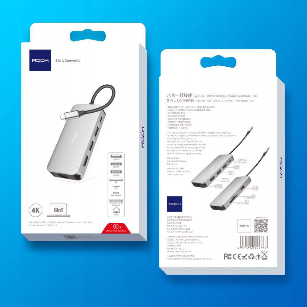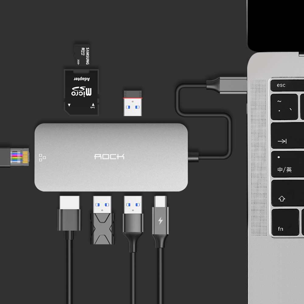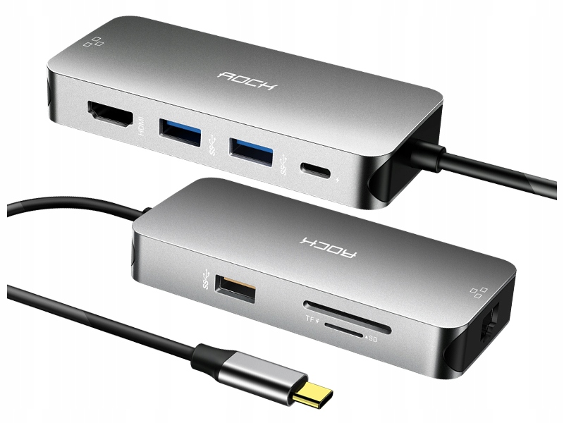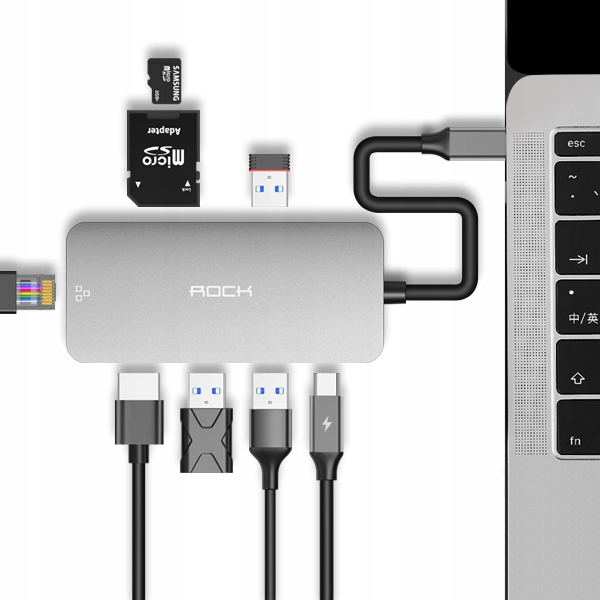 HUB SUB-C 8w1 ROCK - jest to panel rozszerzeń do urządzeń wyposażonych w port UBS-C. Pozwala podłączyć wiele różnych urządzeń co czyni go bardzo uniwersalnym, obudowa została wykonana z aluminium przez co cała konstrukcja jest lekka a zarazem bardzo wytrzymała. Port USB-C wspierający technologię Power Delivery (PD) pozwala na ładowanie urządzeń Apple wyposażonych w port USB-C. Adapter wyposażono w trzy porty USB 3.0, jeden port HDMI wspierający 4K, czytnik kart SD, TF oraz port RJ45 działający w technologi Gigabit Ethernet.